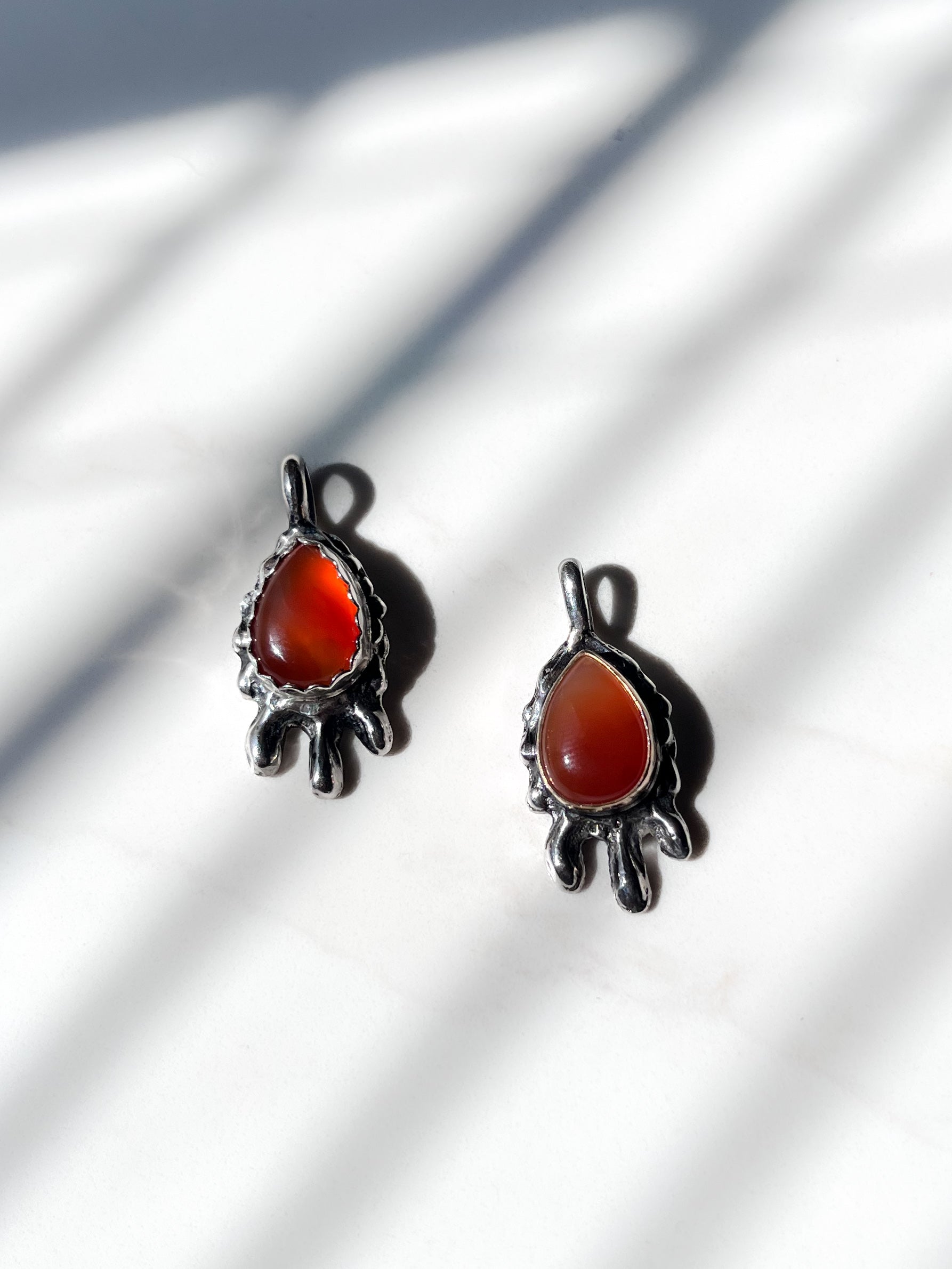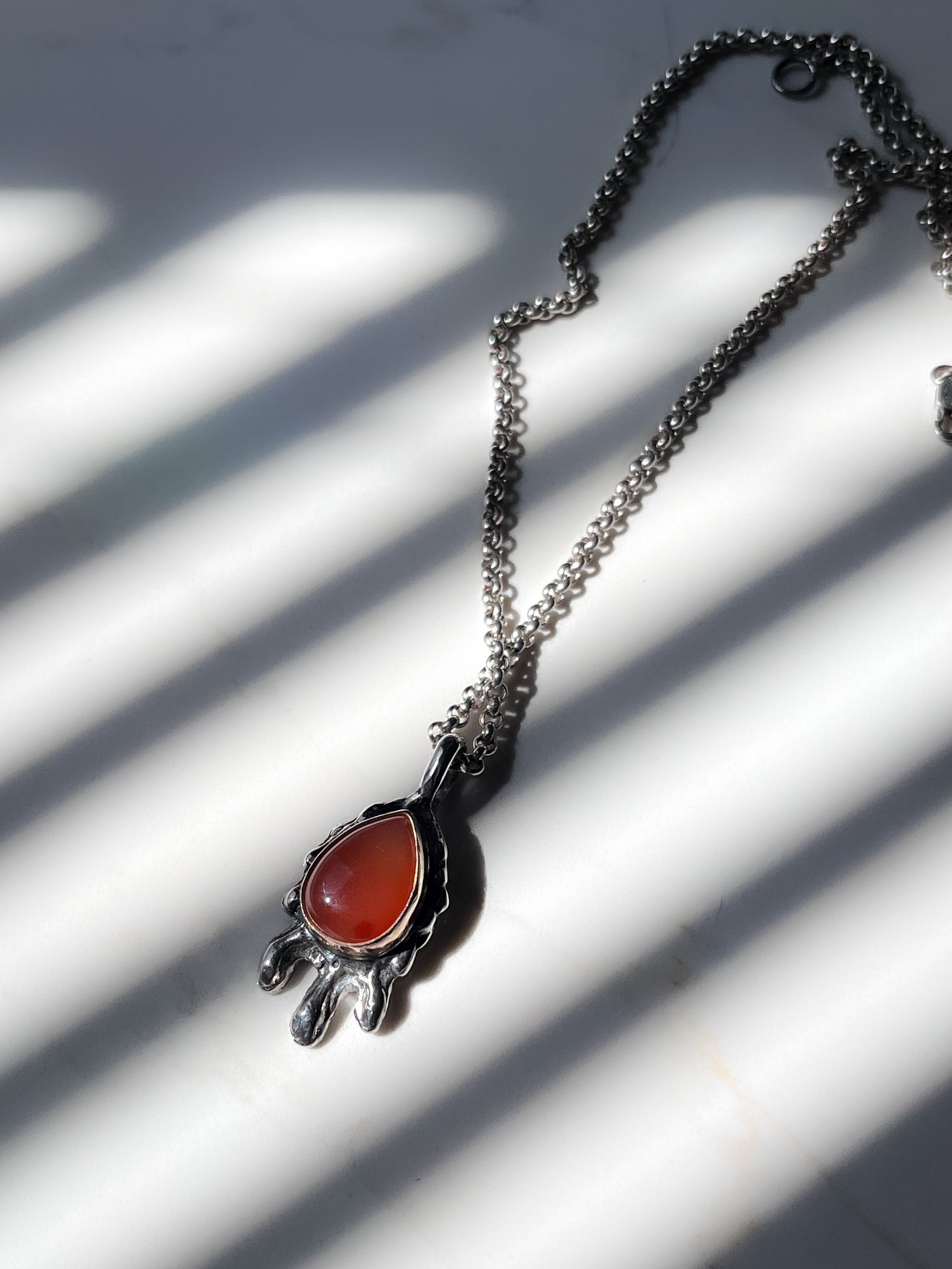 Handcrafted from reclaimed scrap sterling silver and fine silver and gold filled. This pendant cradles a fiery carnelian gemstone in a molten, wax-like setting. The silver edges flow like candle drips, while the carnelian glows like a flame within.